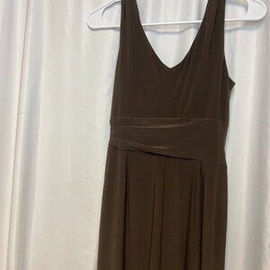 Keywords: Anne Klein gown, brown evening dress, embellished V-neck gown, formal wedding guest dress, sleeveless draped gown, brown cocktail dress, luxury evening wear, gala gown, holiday party outfit, beaded neckline dress