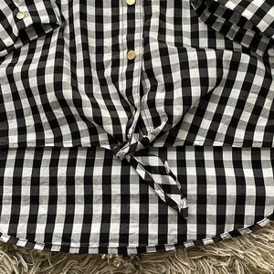 Great shirt. Black plaid. 3/4 cuffed sleeves. Tie knot at waist. Gold buttons.