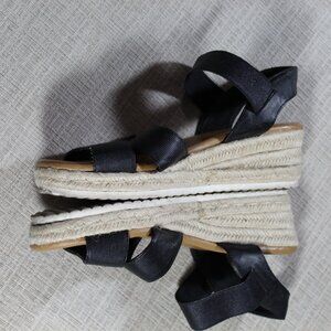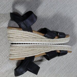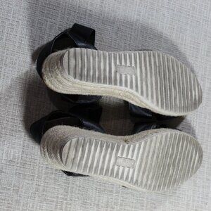 Let these Anne Klein sandals add a lift to your wardrobe. Classic black sandals with rope accents along the raised footbed. Excellent preowned condition - the only signs of wear is the dirt stains on the soles.