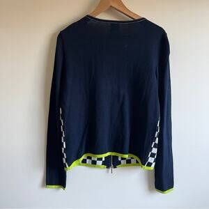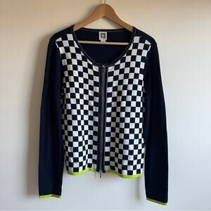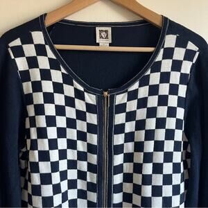 Anne Klein Checkerboard Zip Front Cardigan Preppy Retro Navy & White Size Large