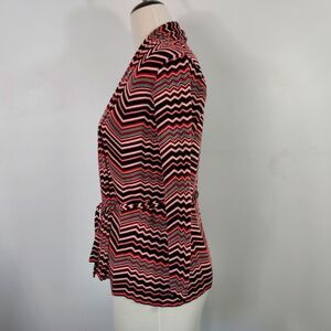 Anne Klein Chevron Cardigan Sweater size Small Open Front Tie Belt Red Black