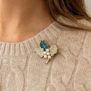 Anne Klein Christmas Gold-Tone Crystal Holly Pearl Berries Brooch