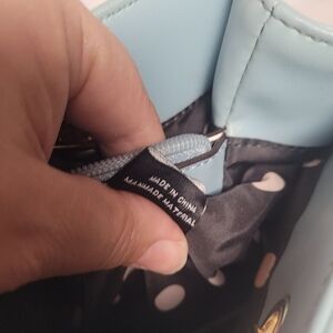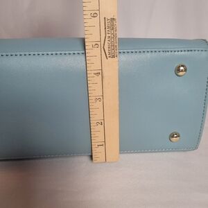 Anne Klein Coast Is Clear Ice Baby Blue Shoulder Bag. Has gold tone hardware. Interior is black with white polka dots. 3 sections with slip pockets and zip pockets. In great preowned condition. Measurements are approximate and are shown in photos.