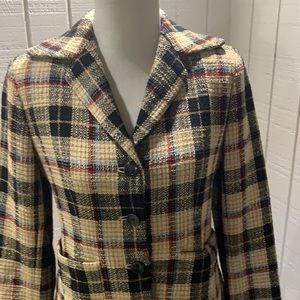 Beautiful multi-colored (black, tan, cream, blue, red) plaid coat. Mid thigh length. Patch pockets.