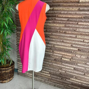 Hot pink, Orange and white colorblock sleeveless sheath dress with V neck