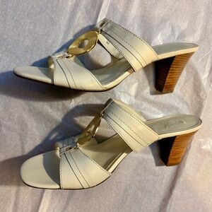 Anne Klein iFlex Ivory Leather Sandals with Gold Ring Detail – Block Heel Size 9