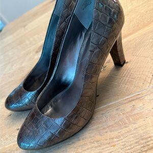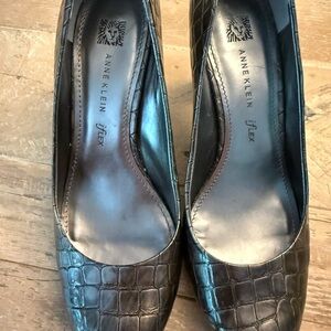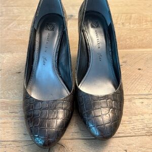 Gently pre owned Anne Klein Pewter Croc patterned pumps. Size 8.5