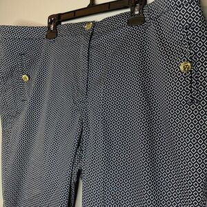 These Anne Klein cropped pants feature a chic black and white geometric pattern, perfect for a polished yet comfortable look. With gold button accents on the pockets and waistband, these pants add a touch of elegance to any outfit. Ideal for both casual and professional settings, they offer a flattering fit with versatile style. Pair them with a blouse for work or a casual top for a weekend outing. Plus size 16