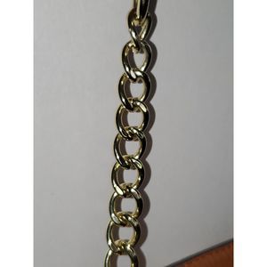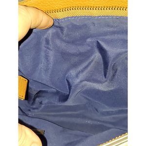 This Anne Klein crossbody purse is in very nice pre-owned condition. It is a goldish color with white polka dots - perfect for a spring/summer look. The strap is adjustable and it part faux leather and part chain. The inside is a nice blue color with one large open pocket and a smaller zippered pocket on the interior rear. The front exterior has a pocket with a flap, and it has a magnetic closure on that pocket with the lion head on it. This piece will show some slight wear on the bottom as shown in pictures but has lots of life left in it. Bag is about 10" wide and 7" tall.