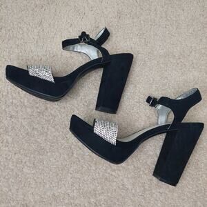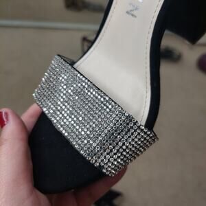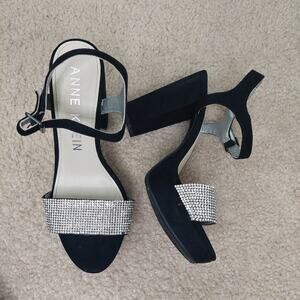 These are block heels with an adjustable ankle strap and crystal detailing by Anne Klein in size 6. One crystal missing from each shoe as shown in the picture so these are heavily discounted. However, you can't even tell from afar. These are brand new and never worn. The bottoms are still perfectly clean. 4 inch heels