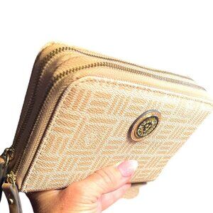 Anne Klein Designer Zip Around Neutral Tan Wallet w/Gold Lion Head Logo Emblem