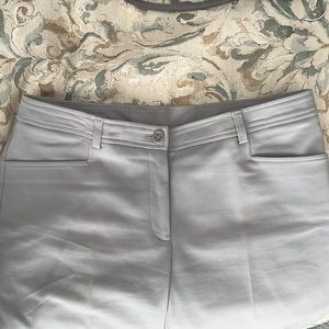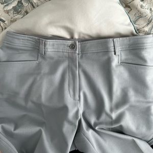 Outer and inner button at waist with zipper closure; belt loops; top stitching