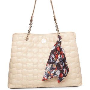 This AK quilted satchel comes with a center zip compartment and three other inside pockets. It has beautiful chain detailing at the straps and comes with a crossbody strap for added wardrobe versatility. If scarves arent your thing, the floral print scarf on this satchel can be removed.