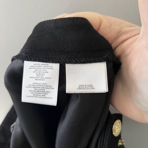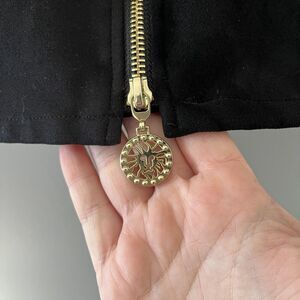 Black, faux suede pencil skirt with a gold tone exposed zipper down the front. Should hit around the knees on most. Size 14.