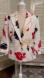 Stylish blazer with bold floral design. Features red and black flowers on a white background and statement tie at the sleeve. Perfect for a polished look.