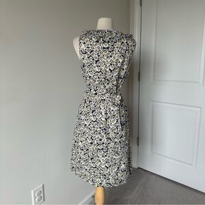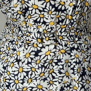 Elegant sleeveless dress featuring a navy and white floral daisy pattern with a Peter Pan style collar and matching belt. Perfect for any occasion. Function pockets. Light weight material. No holes or stains. Comes from a smoke free environment.