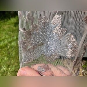 This lovely skirt is in new condition with tags. It has an elastic waist, which allows it to fit a variety of sizes. The overskirt has lovely floral lace sequin detailing in silver and pink with a pink under skirt. Measurements are shown in photos, but it should fit oversized for a size large with an approximately 34 inch waist with elastic not stretched.