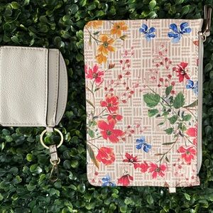 Floral print small clutch with vibrant colors. Cream leather accents. Includes matching cardholder. Handy for make up, and female toiletries