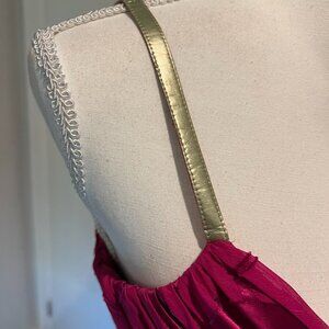 Anne Klein Fuschia Floral Silk Midi Dress w gold straps, Size 2