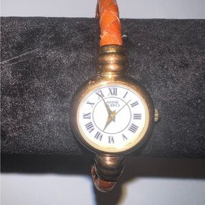 Stylish watch featuring a gold case. Orange strap with textured design. Roman numeral dial adds elegance. Pre-owned
