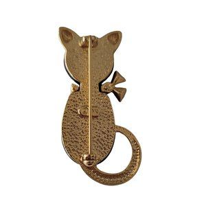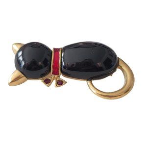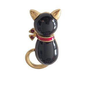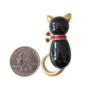 Anne Klein Gold-Tone Black Cat Red Enamel Rhinestone Bow Collar Brooch Pin, E114