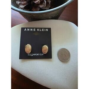 These are a gorgeous pair of Anne Klein Gold-Tone Ridged Button EZ Comfort Clip-On earrings. They are the perfect accessory to add a touch of elegance to any outfit!