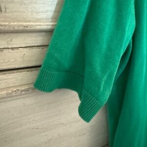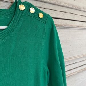 This top is stretchy, form fitting and soft. It has a longer, fitted sleeve (above the elbow) with gold button details. Makes a great business or professional top. Size M