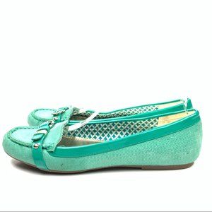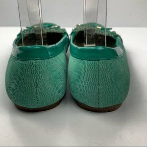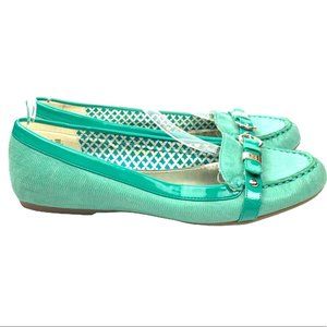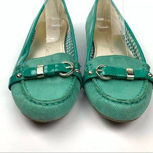 Stylish green loafers by Anne Klein. Features gold buckle detail. Comfortable and chic. Runs true to size.