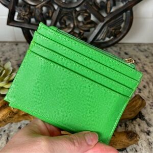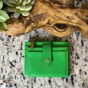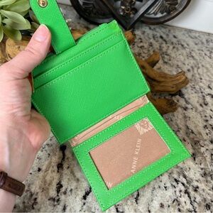 Vibrant green wallet by Anne Klein. Features a sleek design with a gold logo accent. ID holder, one zipped pocket, and 6 additional slots.