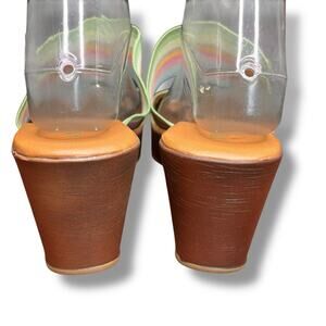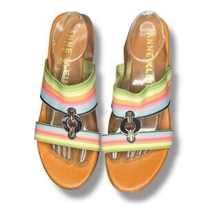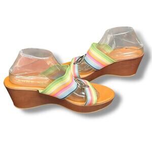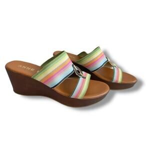Anne Klein Hadya platform wedge sandals. Multicolored striped elastic straps with gold and black medallion accent.
