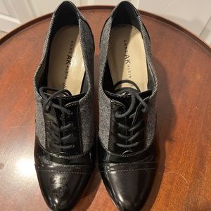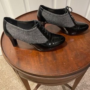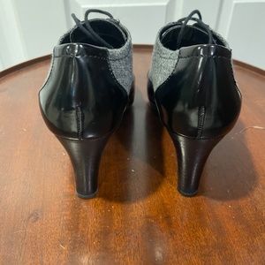 Black patent leather with gray/black material 3” heel Like new & still in the box