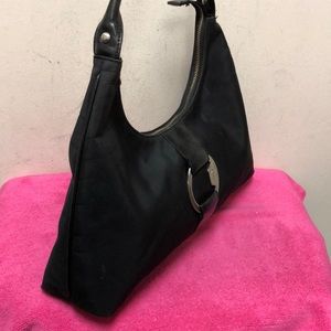 Anne Klein Hobo purse in black in nylon with genuine leather trim. So elegant in its clear cut simplicity with top zipper closure but with missing pull tag. See last frame; otherwise, purse is in very good condition. Spacious. Nice pattern. 16”x9x3”. Item 3048101
