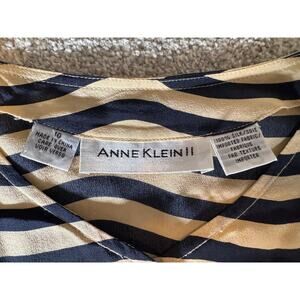 This Anne Klein II silk button-up blouse is a timeless addition to your wardrobe! In excellent condition, this size 10 blouse features a sophisticated navy and beige stripe pattern.