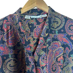 Anne Klein II Wool Silk Paisley Blouse Black Jewel-Tone Button Front Top Size 12