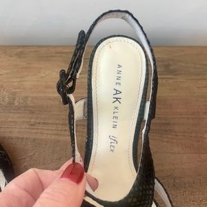 Anne Klein Iflex High Heels, open toe. Size 7.5. EUC - very small scuff on heel. Shiny black snakeskin ankle strap with adjustable buckle closure. Iflex comfort cushion sole. 4" heel