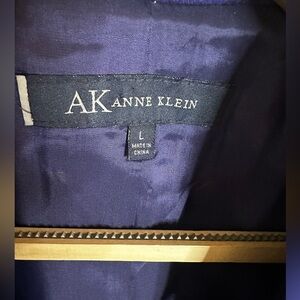 Elevate your wardrobe with this stunning Anne Klein long jacket in a rich jewel-tone purple silk. Featuring a waist tie belt, double-breasted button closure, and 3/4-length sleeves, this piece exudes effortless elegance. Perfect for layering over dresses or chic separates for a sophisticated touch.
