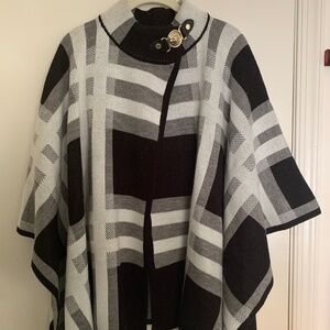 Chic and timeless Anne Klein knit plaid cape/poncho in a versatile black, gray, and white colorway. Features an elegant open-front drape and a statement gold-tone lion crest clasp at the collar.