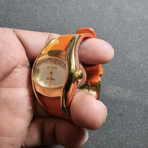 Anne Klein Ladies Quartz Watch Mother Of Pearl Gold Tone Orange Strap Working shows signs of wear such as light scratches see pictures for reference