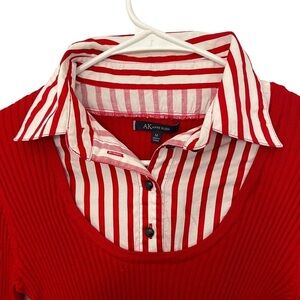 Anne Klein Layered Collar Striped Shirt Sweater | Red | Size M
