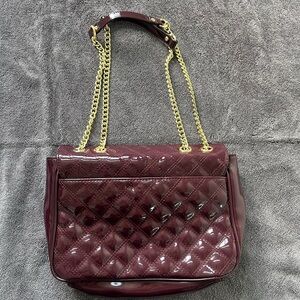 This sophisticated shoulder bag from Anne Klein showcases a rich maroon-purple quilted design, complemented by elegant gold hardware. The bag features a convenient flap closure and a stylish chain strap, making it a perfect accessory for any occasion.