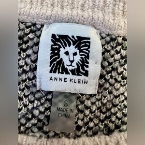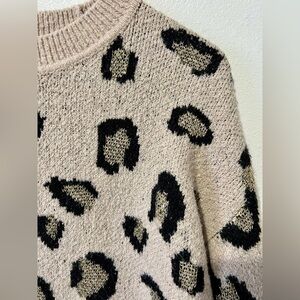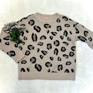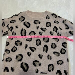 Super soft and cozy Anne Klein branded pull over sweater in all-over leopard/cheetah printed pattern, extra soft fabric with cold metallic detail, crew neckline, ribbed hems.