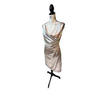 Elegant metallic mini dress. Features a sleeveless design. Perfect for evening wear.