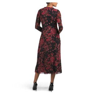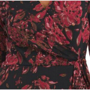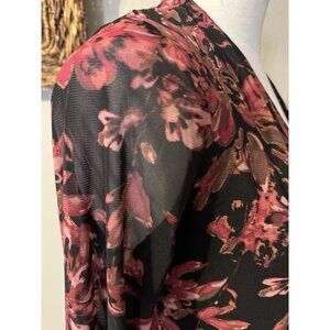 This pretty dress is from Anne Klein in a misses size small. Black, plum, reds, brown/gold and pinks in color. Lined body with sheer sleeves. Soft and stretchy, made of 94% polyester and 6% elastane. Machine washable. Pullover style with stretch in a faux wrap style. Decorative tie on the side. Unstretched, measured from seam to seam across the front:bust is 18.5 inches across