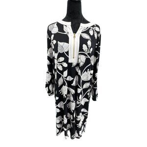 Elevate your wardrobe with this Anne Klein tunic dress, featuring an elegant black and white floral print. Its stretchy fabric ensures comfort and style.
