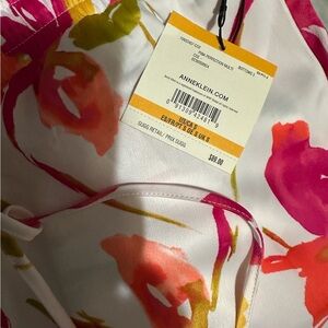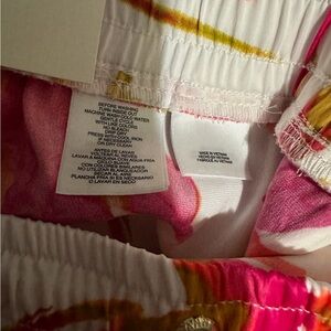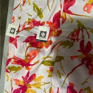 Bold floral pants with vibrant pink, orange, and green patterns. Stylish and eye-catching design.