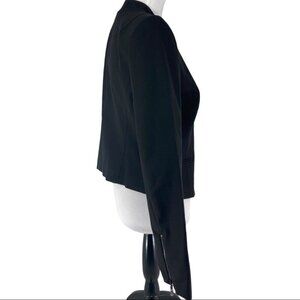 Anne Klein size 8 black blazer. It has a 1/2 zip closure, long sleeves with zip cuffs, crop length, collarless, two front functional pockets, lined with shoulder padding. Materials shell 98% cotton, 2% elastane, lining 95% polyester, 5% spandex. Care dry clean only. RN#54050 MFSR $375.00. Condition is new with tags as shown in pictures. Please see the measurements below to ensure fit