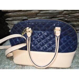 Beautiful quilted pattern navy blue and tan Anne Klein bowler purse. Gold hardware with removable shoulder strap. Like new condition.