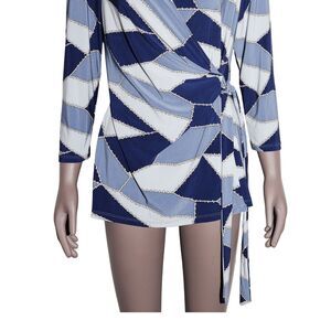 Anne Klein Patchwork Print V-Neck Tie Waist Blouse Boho Retro Medium