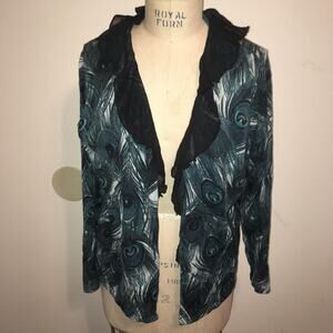 Anne Klein Peacock Print Silk-Cotton-Nylon Ruffle Neck Cardigan Sweater 0X NWT