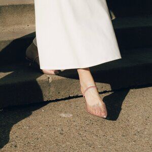 Chic mauve kitten heels with small pink rhinestones for flare! Features a cushioned footbed, pointed toe, and subtle strap. Size 11. Excellent Condition. The strap can be worn behind the heel or on top of the foot, as shown in my wedding photos.